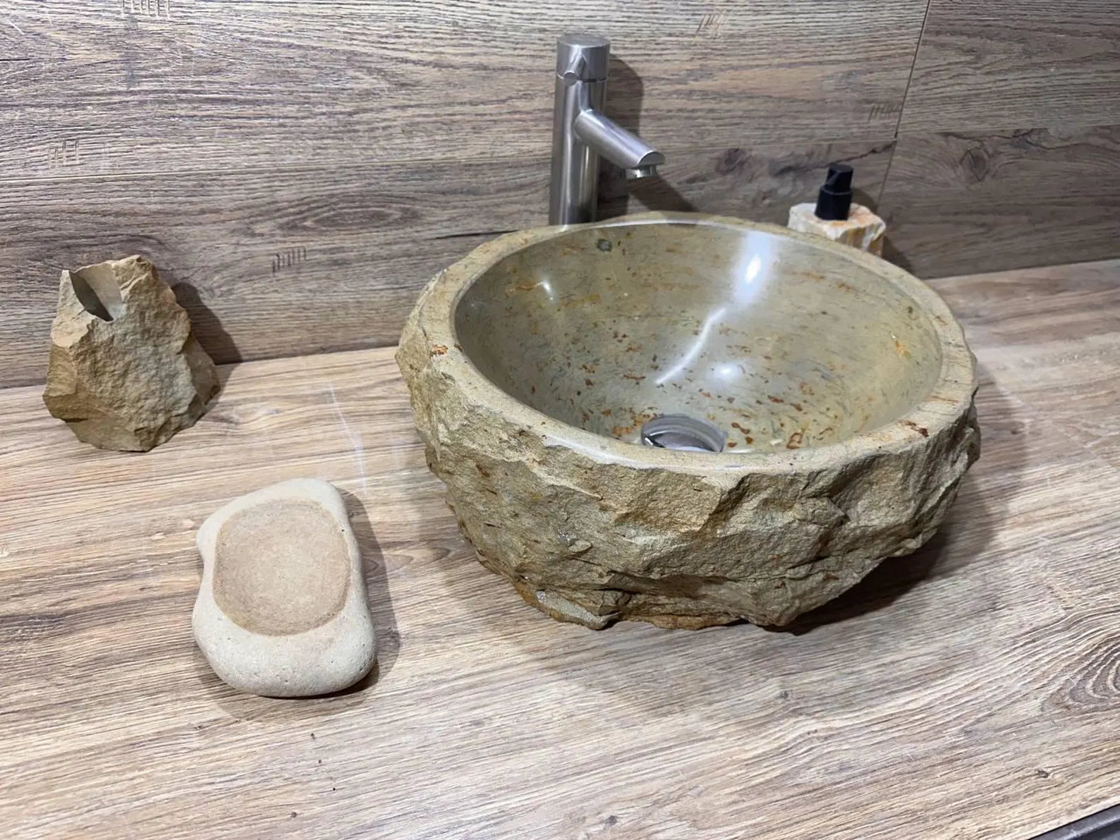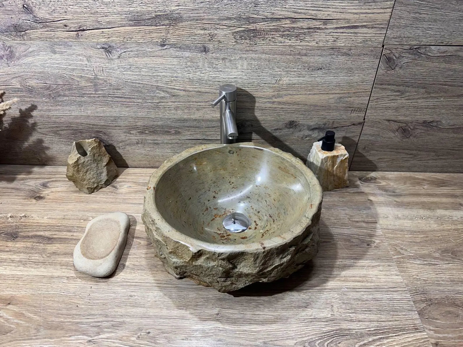 This rustic vessel sink is designed to be a countertop sink, adding a touch of elegance to your bathroom. Its polished stone finish adds a luxurious and timeless appeal, perfect for both modern and traditional styles. The sink is mounted on a plinth, showcasing its beauty and adding a sophisticated touch to your space.